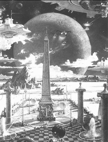 1944年,美国太空美术大师邦艾斯泰(C h e sle y B o n e ste ll)发表了处女作《“土星世界”组画》,揭开了现代太空美术的序幕。在此之前的太空美术作品比较粗糙、幼稚,多属于图解性质,邦艾斯泰将太空美术提升到了一个新的艺术高度,为太空美术成为独立的绘画领域奠定了基础。